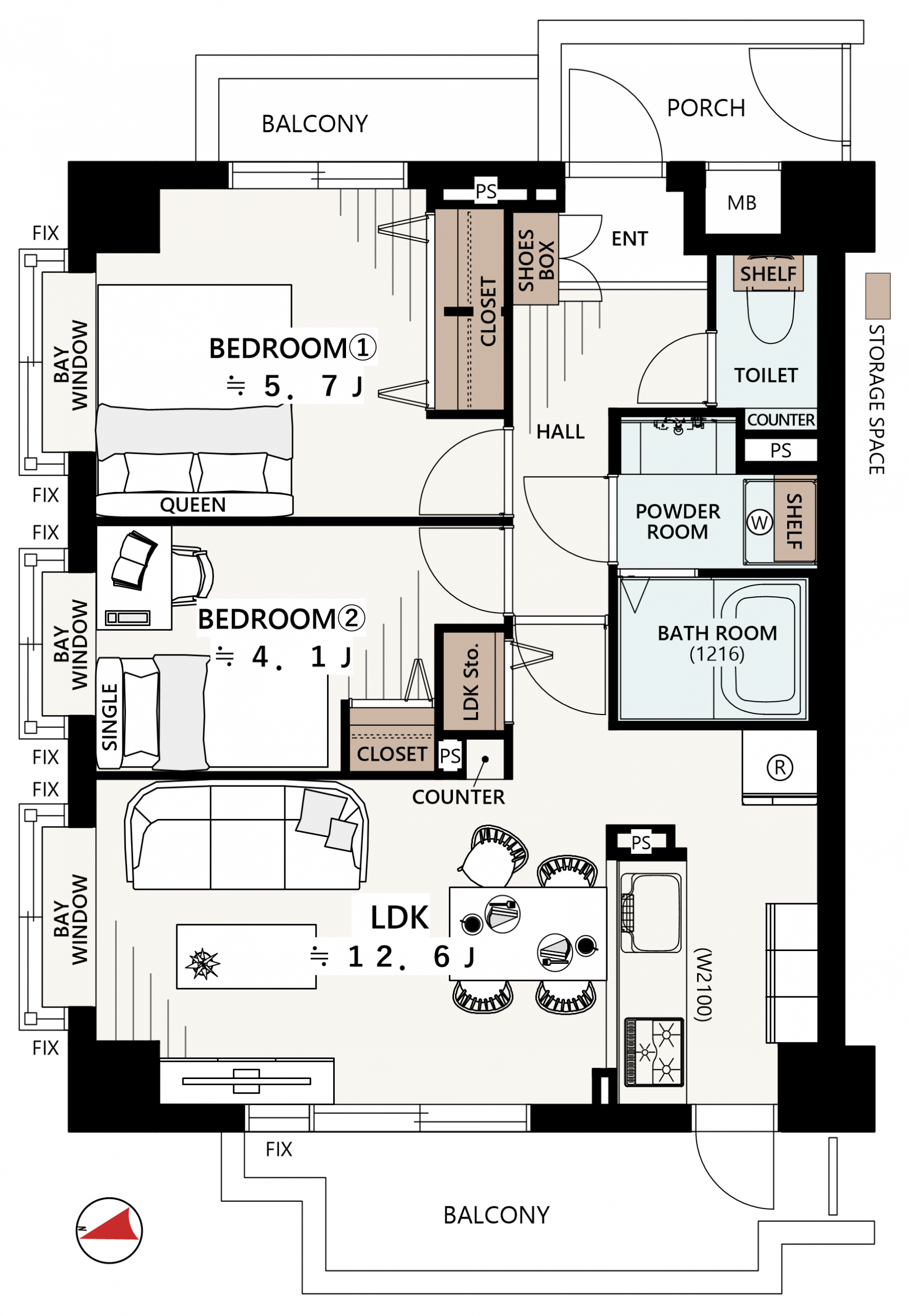 ยูนิตห้องมุม แสงเข้าสามด้าน! ระเบียงทั้งสองด้าน หน้าต่างแบบเบย์วินโดว์
