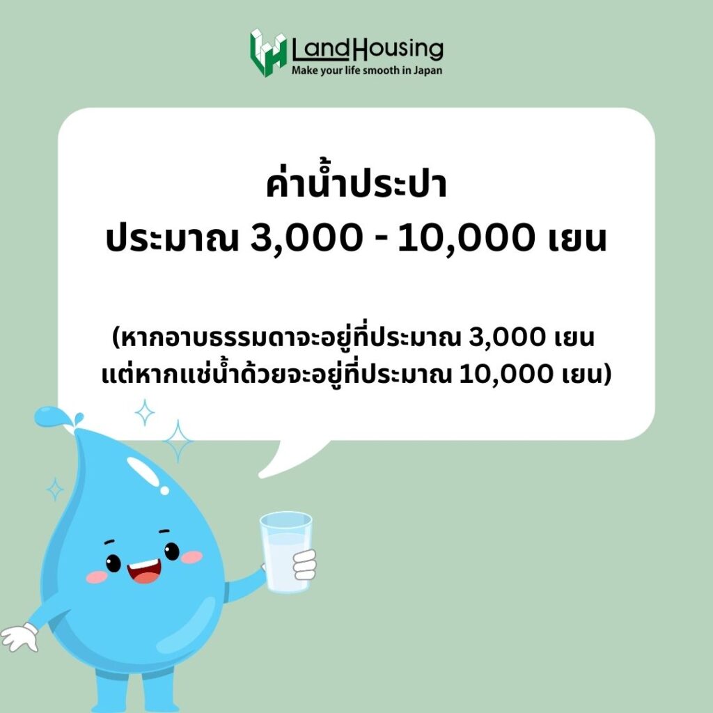 ค่าน้ำประปา เป็นค่าใช้จ่ายในชีวิตประจำวันของทุก ๆ คน ค่าใช้จ่ายหากใช้แบบประหยัดจะอยู่ที่ 3,000 เยน ต่อเดือน