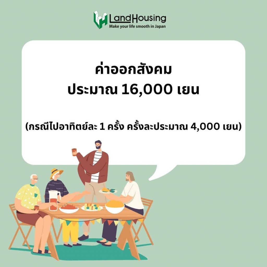 ค่าออกสังคม ประมาณ 16,000 เยน ต่อเดือน หากออกไปรับแระทานอาหารสังสรรค์กับเพื่อน ๆ สัปดาห์ละ 1 ครั้ง