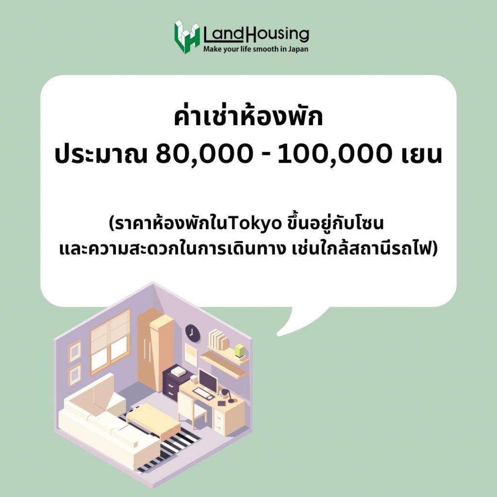 ค่าเช่าห้องพัก หากเป็นห้องเช่าทั่วไปใน Tokyo ราคาจะอยู่ที่ประมาณ 80,000 – 100,000 เยน (ราคาขึ้นอยู่กับโซนที่พักอาศัย และระยะห่างระหว่างห้องพักและสถานีรถไฟด้วย) แต่หากต้องการประหยัดงบ ก็สามารถอยู่ Share House ได้ เริ่มต้นประมาณ 41,000 เยนต่อเดือน ดูรายละเอียดได้ที่นี่