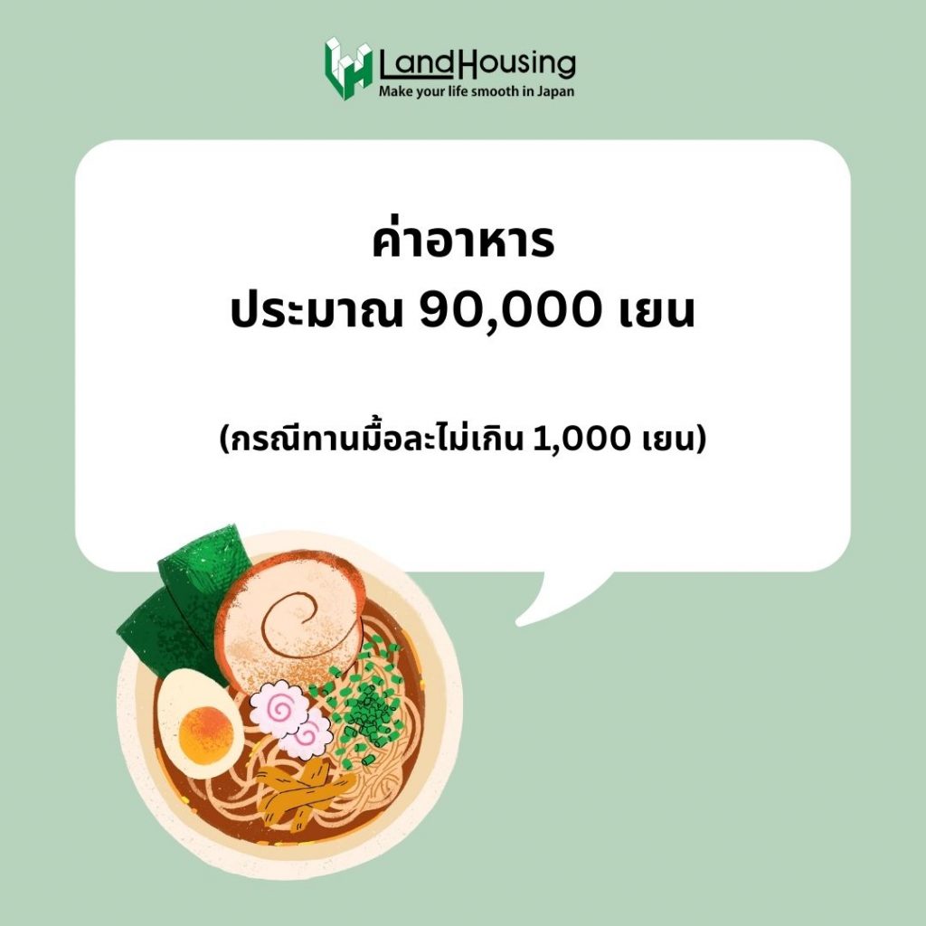 ค่าอาหาร โดยปกติอาหารญี่ปุ่นจะราคาอยู่ที่ 500-1,000 เยนต่อมื้อ โดยต่อเดือนค่าอาหารจะอยู่ที่ประมาณ 90,000 เยน