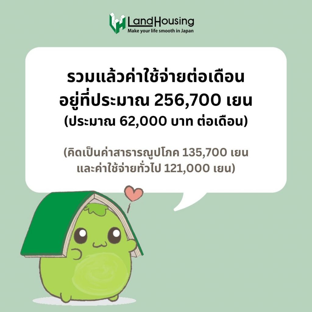 รวมแล้วค่าใช้จ่ายต่อเดือน อยู่ที่ประมาณ 256,700 เยน หรือ คิดเป็นประมาณ 62,000 บาท ต่อเดือน