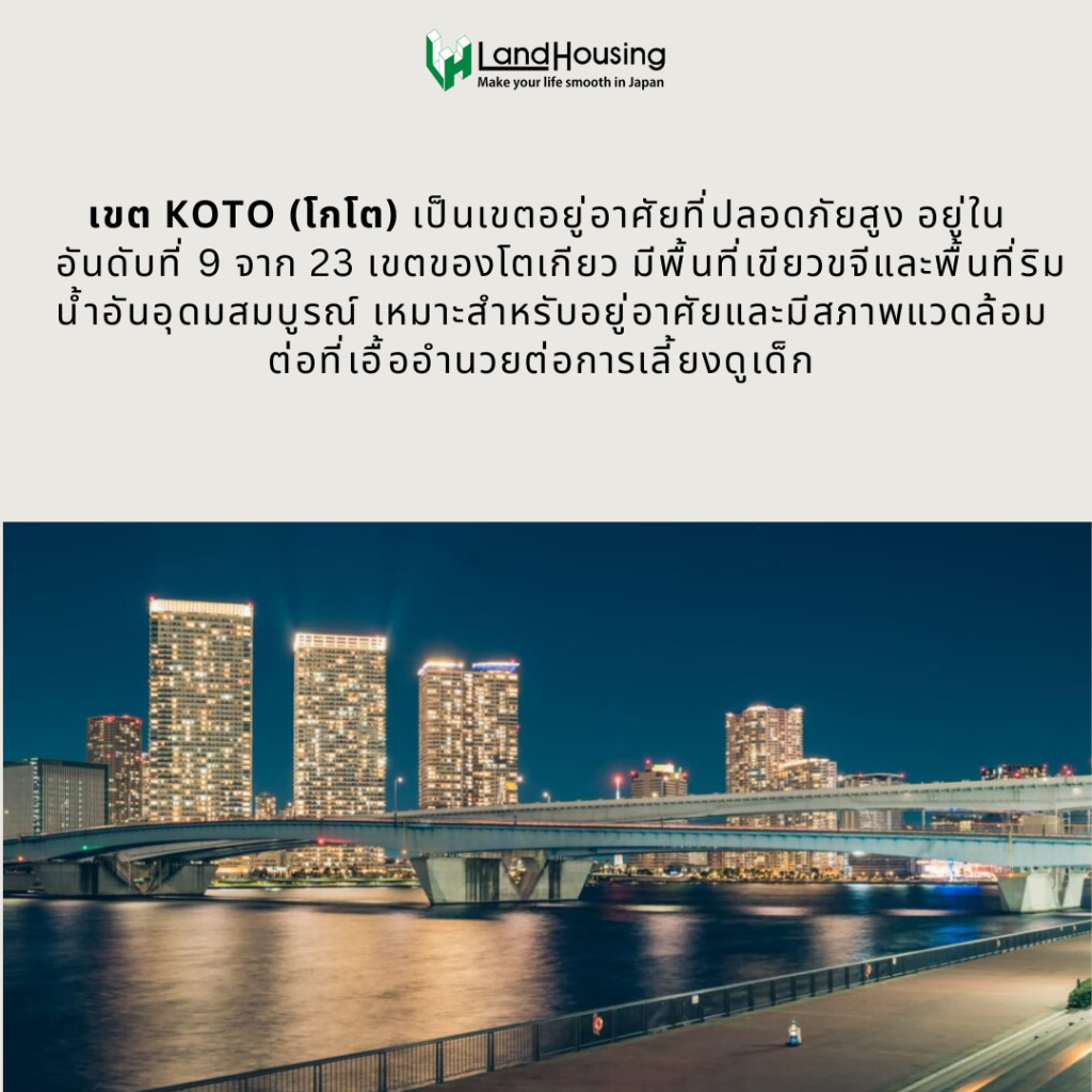 เขตโคโต (Koto) เป็นหนึ่งใน 23 เขตพิเศษของกรุงโตเกียว ตั้งอยู่ทางทิศตะวันออกของใจกลางเมือง มีชื่อเสียงในเรื่องวิวทิวทัศน์ริมทะเลที่สวยงาม สถานที่ท่องเที่ยวที่ทันสมัย และบรรยากาศที่ผ่อนคลาย แตกต่างจากย่านอื่นๆ ในโตเกียวอย่างสิ้นเชิง