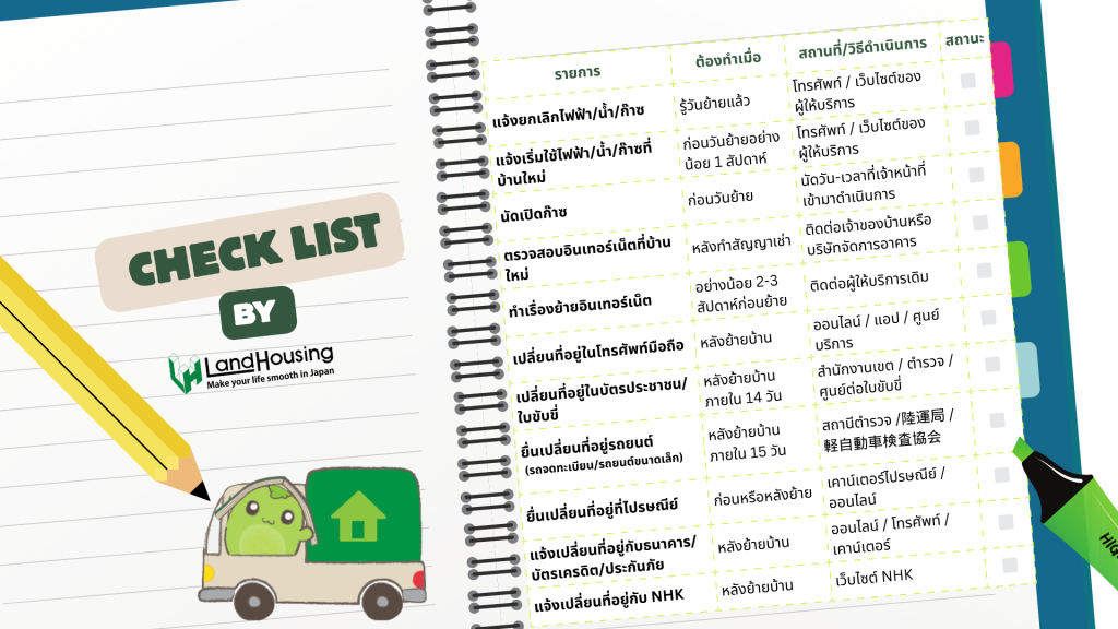 การย้ายบ้านเกี่ยวข้องกับขั้นตอนหลายอย่าง ทั้งเรื่องสาธารณูปโภค เอกสารยานพาหนะ และการแจ้งเปลี่ยนที่อยู่กับหน่วยงานต่าง ๆ เพื่อให้ชีวิตหลังย้ายบ้านเป็นไปอย่างราบรื่น แนะนำให้ทำ เช็กลิสต์ รายการที่ต้องดำเนินการและกำหนดเวลาให้ชัดเจน เพื่อจะช่วยป้องกันการลืมทำเรื่องสำคัญได้