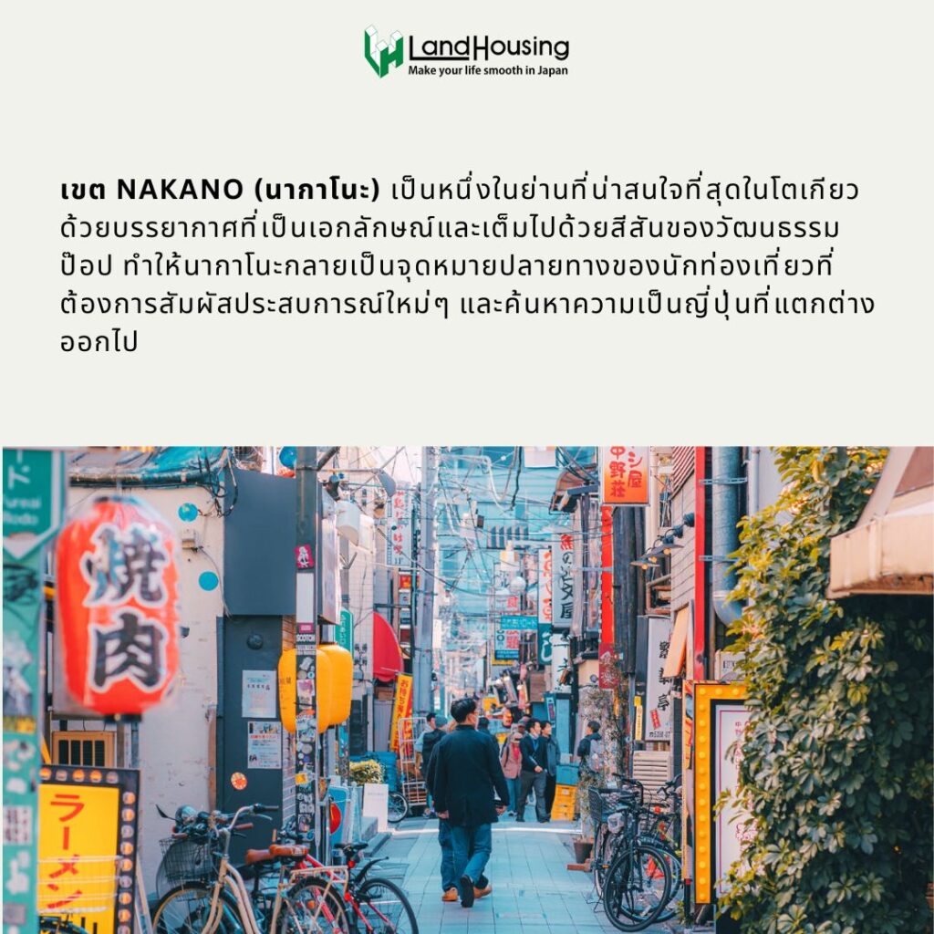 Nakano เป็นเขตที่มีความสำคัญและมีชีวิตชีวาในโตเกียว หนึ่งในปัจจัยสำคัญที่ทำให้เขตนี้มีเสน่ห์ก็คือระบบขนส่งสาธารณะที่สะดวกสบาย โดยเฉพาะอย่างยิ่งสถานีรถไฟที่สำคัญหลายแห่งที่ตั้งอยู่ในเขตนี้ เขตนากาโนะอยู่ลำดับที่ 12 จาก 23 เขตในโตเกียว โดยมีมูลค่าที่ดินเฉลี่ยอยู่ที่ประมาณ 634,700 เยน/ตารางเมตร