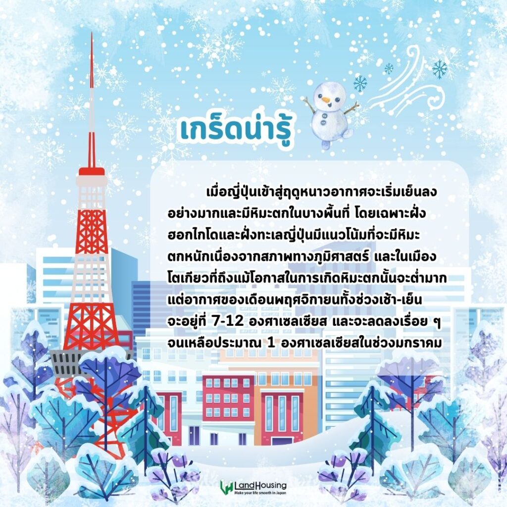 ในช่วงพฤศจิกายนอุณหภูมิเฉลี่ยของญี่ปุ่นลดลงเพราะกำลังเปลี่ยนผ่านจากฤดูใบไม้ร่วงเข้าสู่ฤดูหนาวในเดือนธันวาคม วันนี้พวกเรา LandHousing จะมาแนะนำการเตรียมตัวรับมือกับอากาศหนาวสำหรับเพื่อน ๆ ที่กำลังเรียนต่อ หรือ ทำงานในโตเกียวครับ