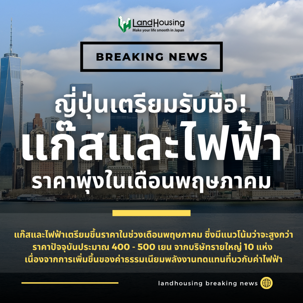เตรียมตัวให้พร้อม! แก๊สและไฟฟ้าเตรียมขึ้นราคาในช่วงเดือนพฤษภาคม มีแนวโน้มว่าจะสูงกว่าปัจจุบันประมาณ 400 ถึง 500 เยนจากบริษัทรายใหญ่ 10 แห่ง เนื่องจากการเพิ่มขึ้นของค่าธรรมเนียมพลังงานทดแทนบวกกับค่าไฟฟ้า