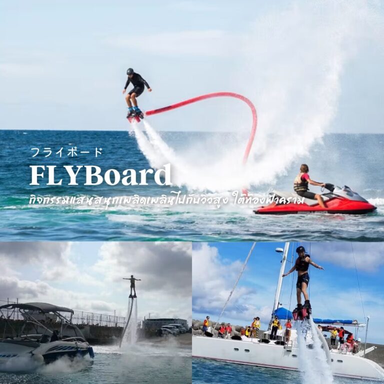 ฟลายบอร์ดใช้อุปกรณ์ที่คล้ายพ่นไอพ่นติดกับขาเพื่อลอยขึ้นไปในอากาศโดยใช้แรงดันน้ำ กำลังได้รับความสนใจในฐานะกีฬาทางน้ำที่สามารถเพลิดเพลินได้แบบสบาย ๆ ดูเผินๆ อาจดูยาก แต่ไม่ต้อกังวล จะมีเจ้าหน้าที่คอยให้คำแนะนำอย่างใกล้ชิด ช่วงเวลาที่คุณบินไปสู่ท้องฟ้าอันกว้างใหญ่ของโอกินาว่านั้นเป็นความรู้สึกที่เบิกบานใจอย่างยิ่ง และเมื่อคุณได้ลองแล้วคุณจะต้องติดใจแน่นอน