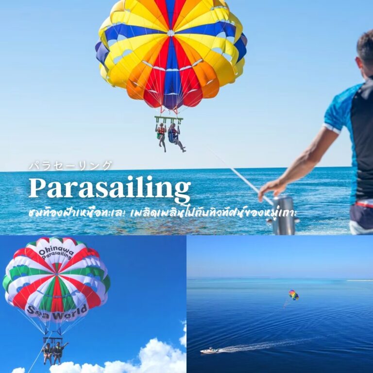 พาราเซลลิ่งเป็นกิจกรรมที่คุณสามารถสัมผัสประสบการณ์การเดินบนอากาศขณะขี่ร่มชูชีพที่ลากโดยเรือยนต์ พร้อมสัมผัสสายลมสบาย ๆ ก็สามารถเพลิดเพลินกับทะเลโอกินาว่าที่สวยงามไปพร้อม ๆ กัน