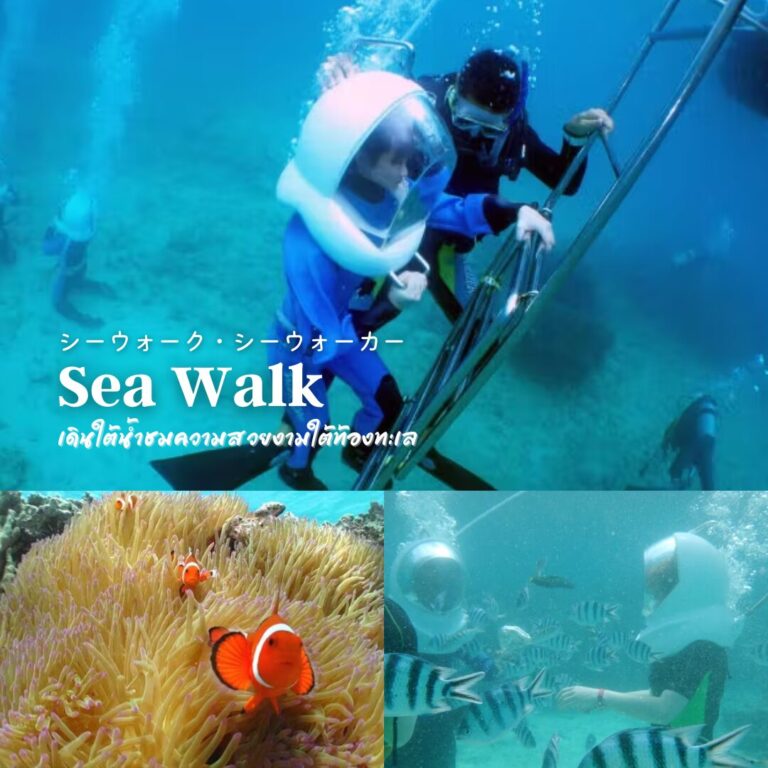 Sea Walk คุณสามารถสวมหมวกกันน็อคใสแบบพิเศษเดินใต้น้ำได้ เสน่ห์คือแม้แต่ผู้ที่ว่ายน้ำไม่เก่งก็สามารถลองว่ายน้ำได้โดยไม่ต้องกังวล และสามารถดำน้ำได้แม้จะแต่งหน้าก็ตาม การเดินเล่นกับปลาตัวเล็กจะช่วยปลอบประโลมจิตใจของคุณ ออกซิเจนจะถูกส่งผ่านสายยาง คุณจึงสามารถผ่อนคลายและเพลิดเพลินไปกับประสบการณ์โดยไม่ต้องกังวลกับการหายใจในทะเล