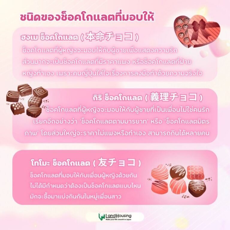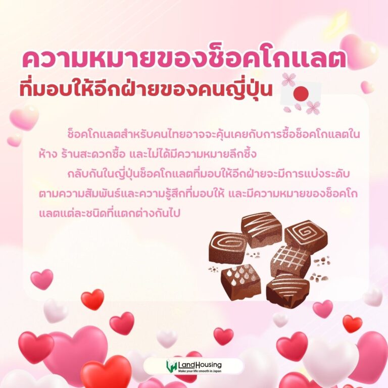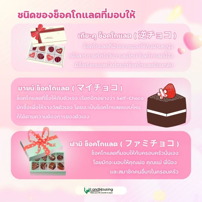 กลับมาอีกครั้งกับเดือนกุมภาพันธ์ที่มาพร้อมกับวาเลนไทน์ เทศกาลแห่งความรักที่มีประวัติมาอย่างยางนาน เพื่อน ๆ ที่ไปอาศัยอยู่ในญี่ปุ่นระยะยาวอาจจะยังไม่รู้ว่าวาเลนไทน์ของญี่ปุ่นนั้นมีอะไรบ้างที่แตกต่างจากไทย วันนี้พวกเรา LandHousing ได้รวบรวมข้อมูลมาให้เพื่อน ๆ ได้เรียนรู้กับวาเลนไทน์ของญี่ปุ่นกันครับ
