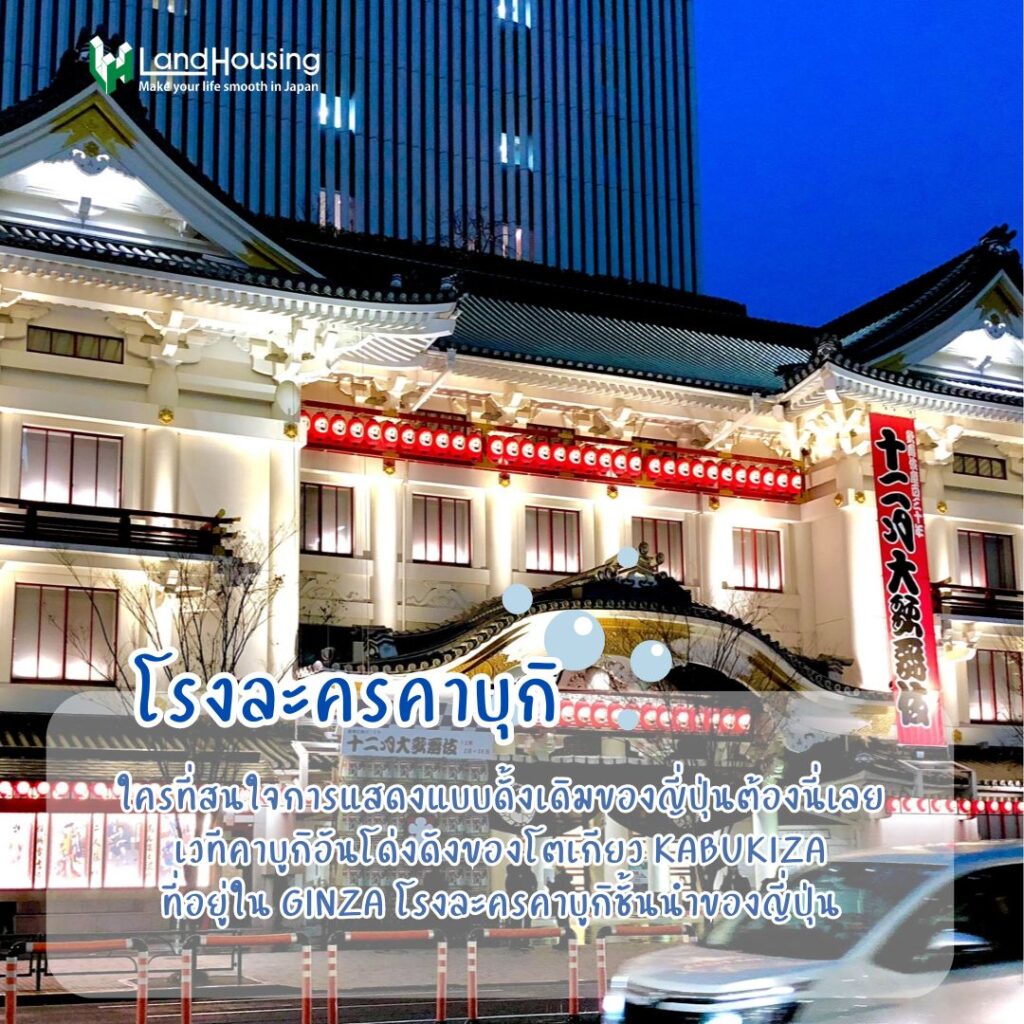 เวทีคาบูกิอันโด่งดังของโตเกียว Kabukiza ที่อยู๋ใน Ginza โรงละครคาบูกิชั้นนำของญี่ปุ่น สร้างขึ้นในปีค.ศ. 1889 เป็นโรงละครที่หรูหรา และเป็นมิตรกับนักท่องเที่ยวซึ่งเป็นสัญลักษณ์ของ Ginza หนึ่งในสถานที่ที่มีชีวิตชีวา และน่าหลงใหลที่สุดในการเรียนรู้เกี่ยวกับศิลปะการแสดงแบบดั้งเดิมของญี่ปุ่น อาคารสามารถรองรับคนได้ประมาณ 2,000 คน