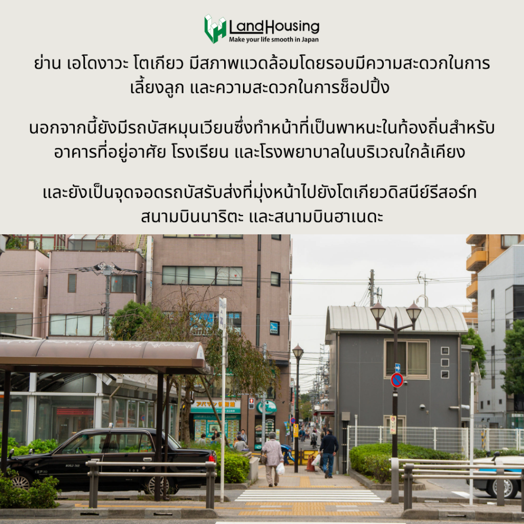 1. สภาพแวดล้อมที่เหมาะสำหรับครอบครัว: เอโดกาวะมีสภาพแวดล้อมที่เงียบสงบ เหมาะสำหรับการเลี้ยงดูบุตรหลาน มีพื้นที่สีเขียวและสวนสาธารณะให้เด็กๆ ได้วิ่งเล่นความสะดวกสบายในการใช้ชีวิต: แม้จะเป็นย่านที่อยู่อาศัย แต่เอโดกาวะก็มีร้านค้า ร้านอาหาร และสิ่งอำนวยความสะดวกครบครัน ทั้งซูเปอร์มาร์เก็ต ร้านค้าสะดวกซื้อ ธนาคาร และโรงพยาบาล