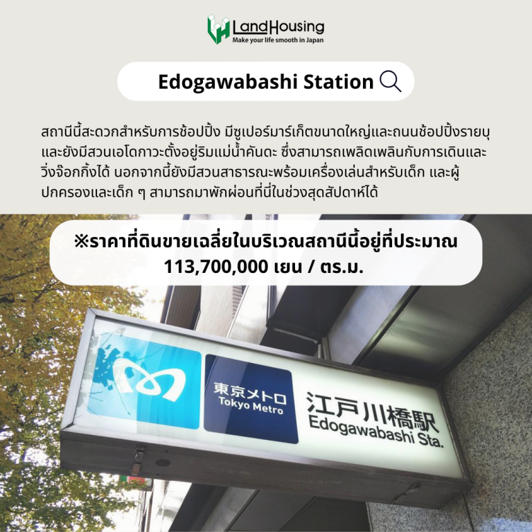 1. สถานี Edogawabashi: เหมาะกับสายช้อปปิ้ง มีซูเปอร์มาร์เก็ตขนาดใหญ่ ถนนช้อปปิ้ง และ- – สวนเอโดกาวะ ริมแม่น้ำคันดะ เหมาะกับการพักผ่อนหย่อนใจ ราคาที่ดินเฉลี่ย: 113,700,000 เยนต่อตารางเมตร