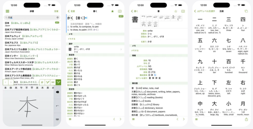 - มีรายการตัวอักษรฮิรากะนะ คาตะกะนะ และคันจิแยกตามหมวดให้เรียนรู้